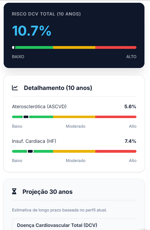 Na prática, o fluxo é simples. O profissional preenche dados básicos como idade, sexo, peso e altura, insere os parâmetros clínicos e, se necessário, adiciona fatores como diabetes ou hipertensão. A partir disso, o sistema realiza automaticamente a avaliação de risco.
