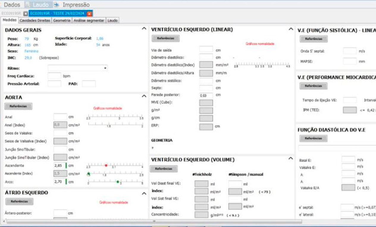 Apresentamos laudos completos para ecocardiografia, com mais de 100 variáveis, desenvolvidos em parceria com renomados especialistas da área. Nossa solução não se limita apenas à ecocardiografia, inclui também laudos de vascular, risco, ultrassom e consultório.