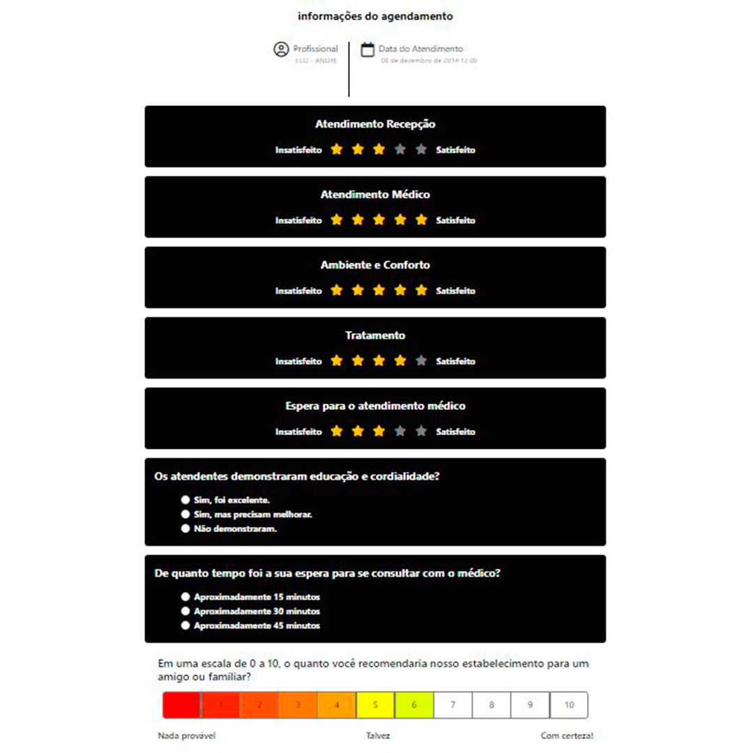 Descubra o Net Promoter Score (NPS) facilmente da sua clínica com nossas pesquisas de satisfação personalizáveis. Depois tenha acesso a BIs dos resultados.